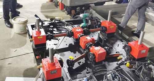 多台聯動絲杆升降機平台,電機在中間,電機連接轉向箱(xiāng)或者K係列減速機,在通過連接杆和···