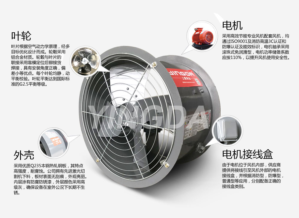 ——防爆型:電機為(wéi)隔爆型、葉(yè)片為(wéi)鋁合金,適用(yòng)於易燃、易爆氣體的環境中,防爆等級(jí)為EXdIIBT4、EXdIICT4。