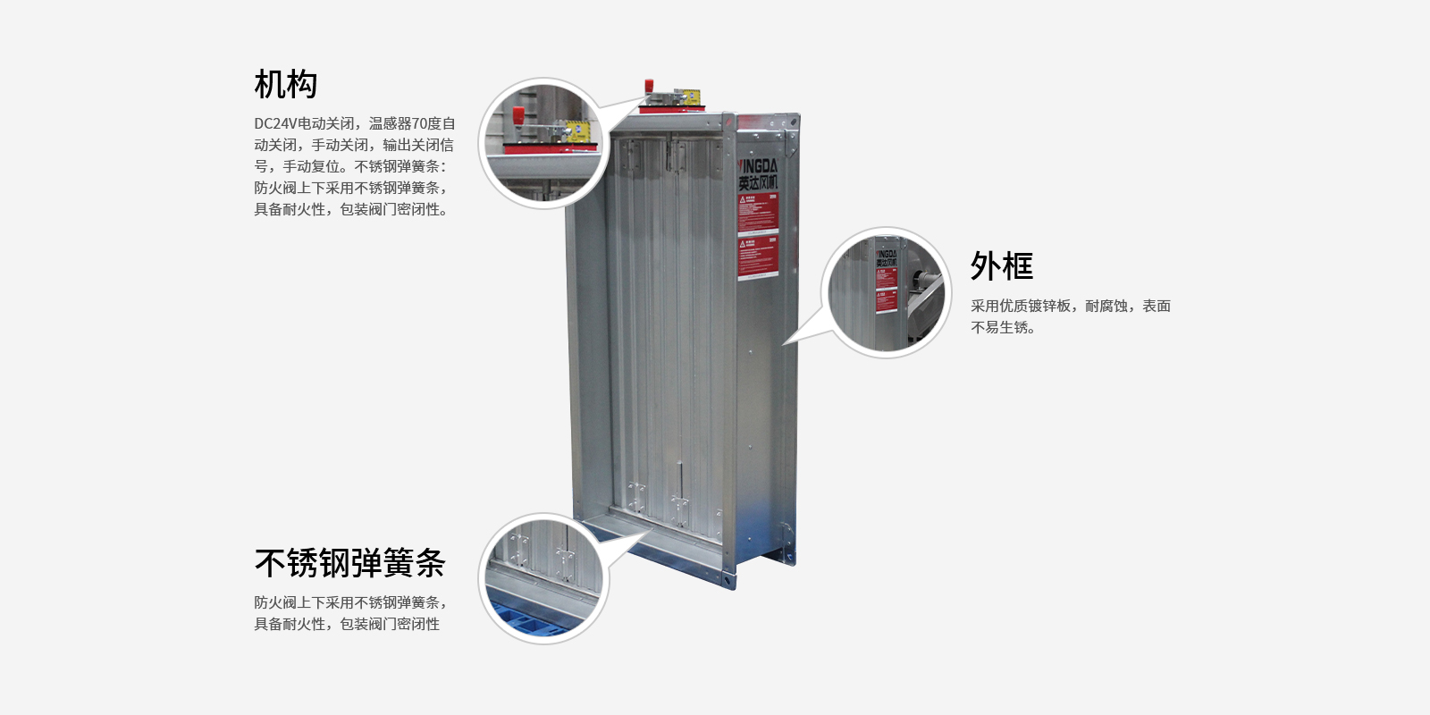 DC24V電動關閉,溫感器70度自動關閉,手動關閉,輸(shū)出(chū)關閉信號,手動複位不鏽鋼彈簧條:防火閥上下采用不鏽鋼彈簧條,具備(bèi)耐火性,包裝閥門密閉性。
